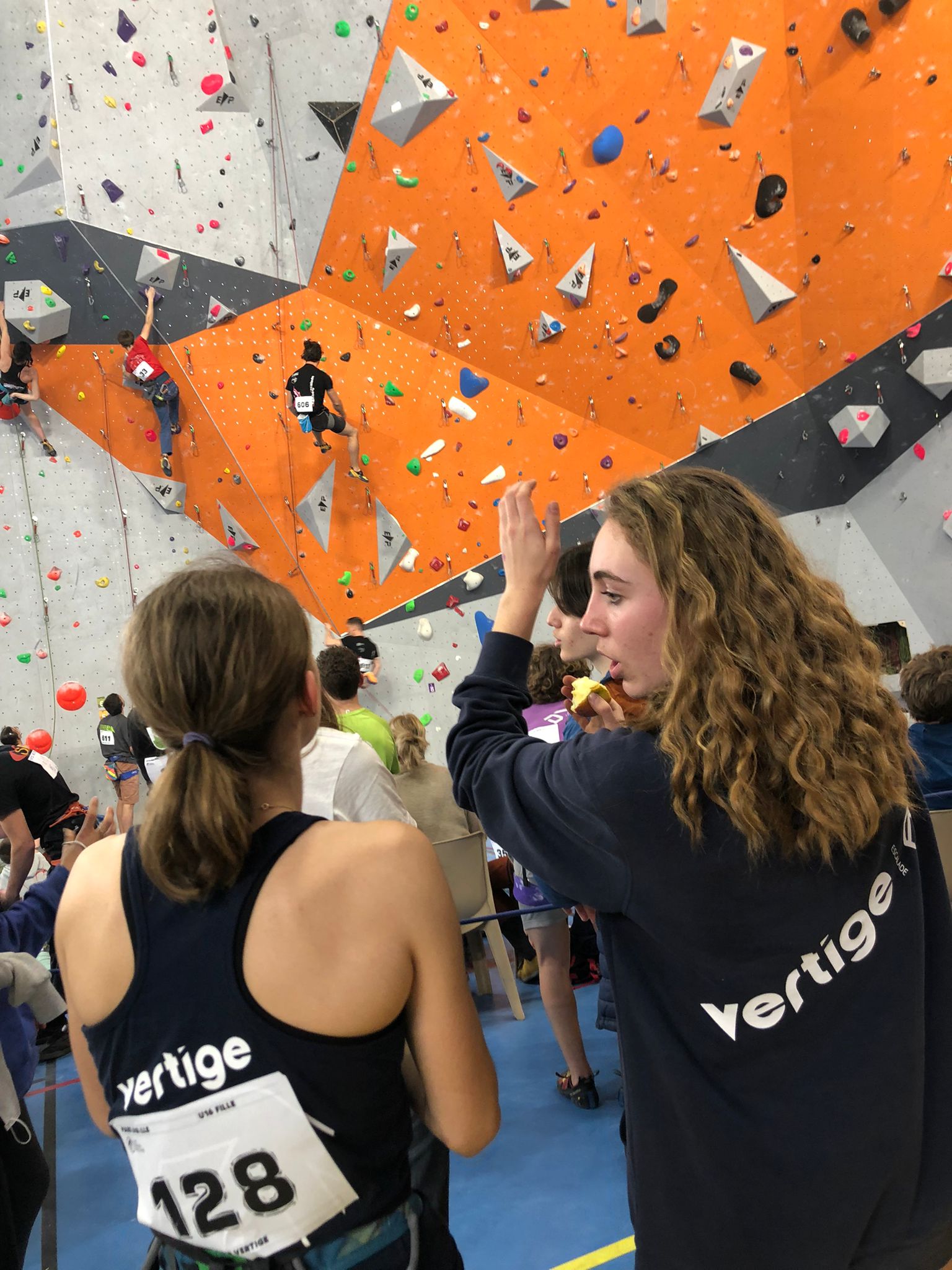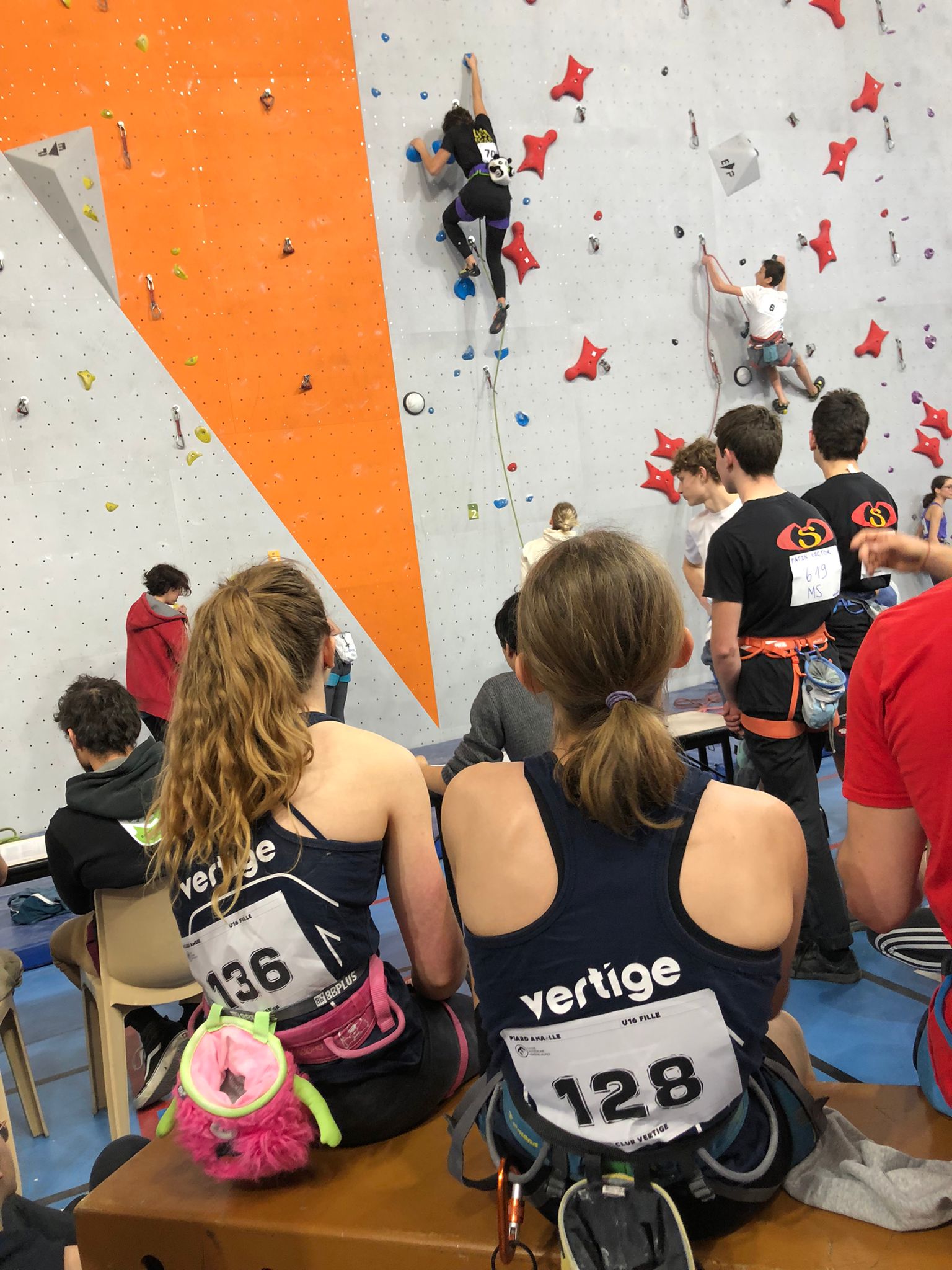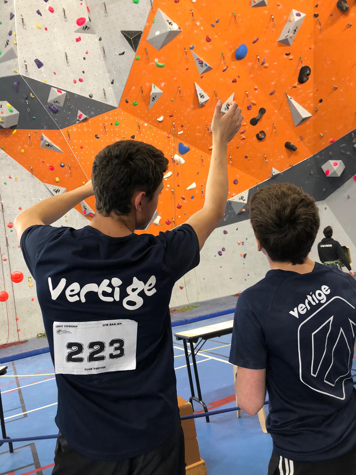 Arrive ensuite la petite équipe bien motivée des U16, avec Ambre, Anaëlle, Léanis et Antonin. Ils découvrent une salle où les masques ont disparu des visages, où la buvette est à nouveau présente… À leur tour de se lancer dans leurs 8 voies de difficulté allant de 5c à 7c, sur trois heures de temps. Avec 42 inscrites chez les U16F et 35 chez les U16H, l’heure était à la tactique… et à l’opportunisme lorsqu’il n’y avait personne dans une voie.